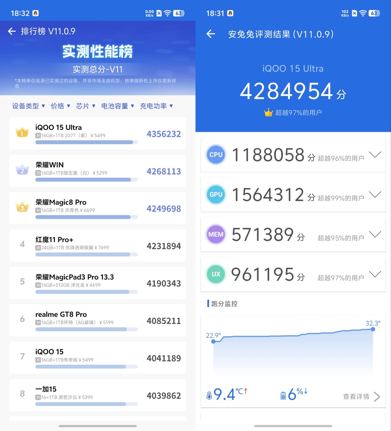 既然都爲風扇這疊醋包了餃子,iQOO15 Ultra在參數上這次肯定是要拉滿了,安兔兔實機測評分數已經來到了TOP 1的位置,依然不負自己最專業的「遊戲機」之名。