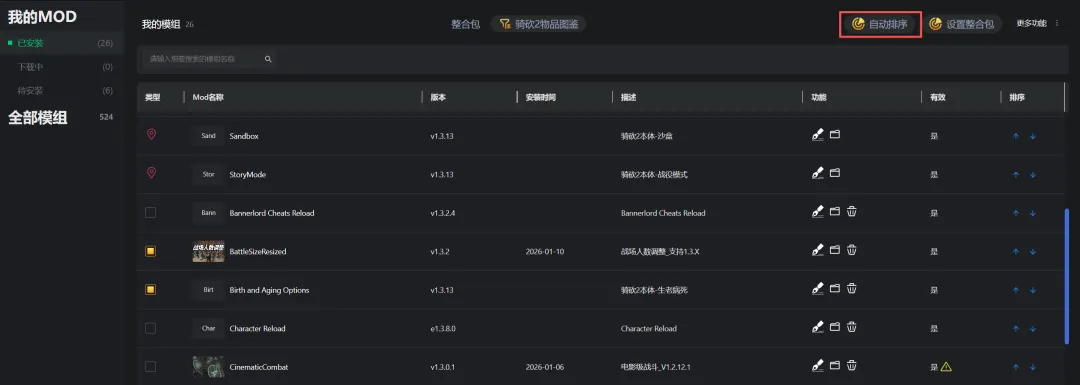 4、在加載順序選項中,點擊自動排序後再點擊啓動遊戲即可進入Mod