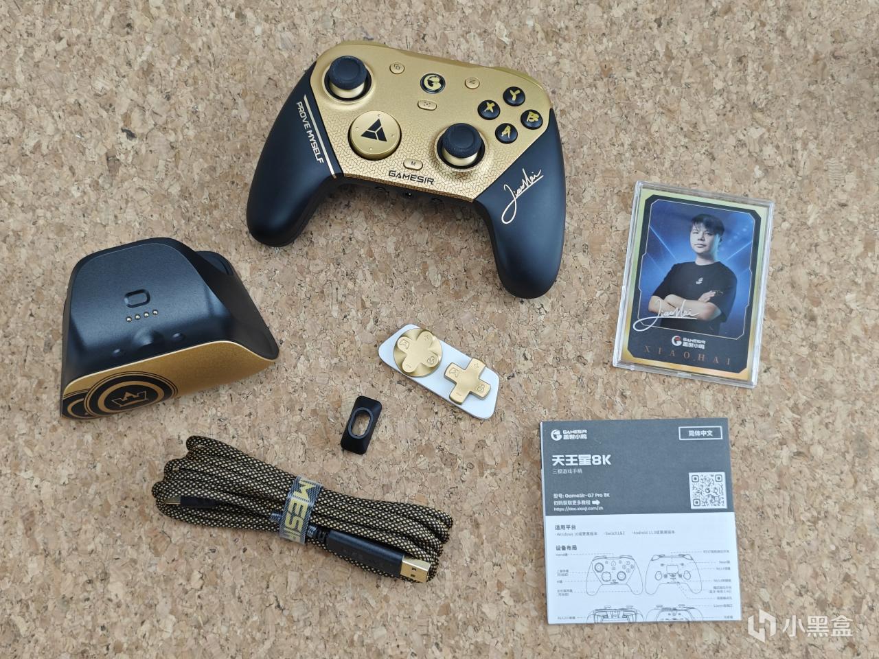 配件方面,除了手柄本體,他還給到了一個智能啓停底座,兩個可替換的十字鍵,一個同色系的編織線,一個固線器,一張小孩的冠軍收藏卡,說明書。