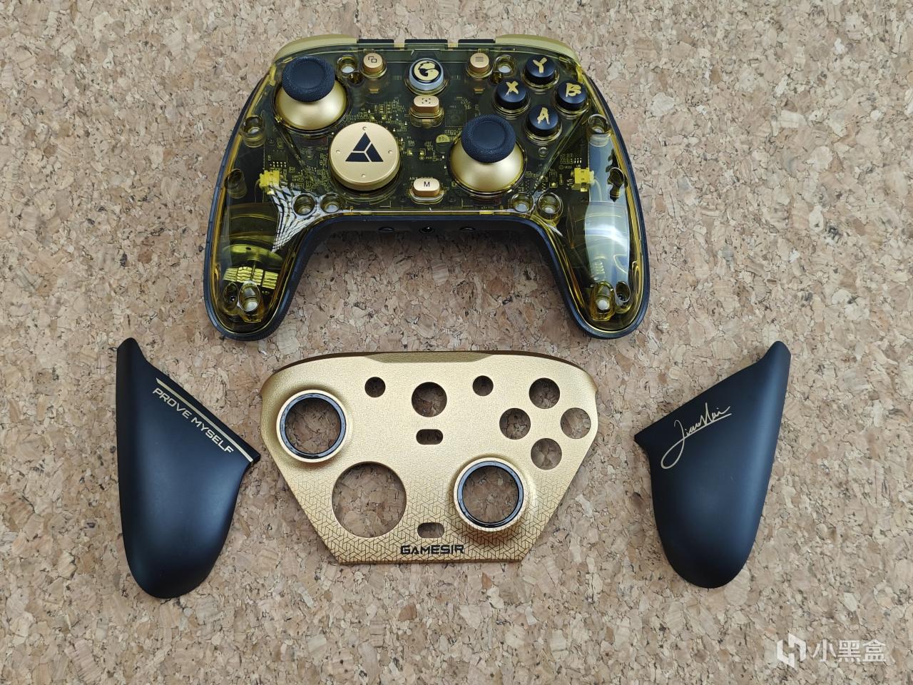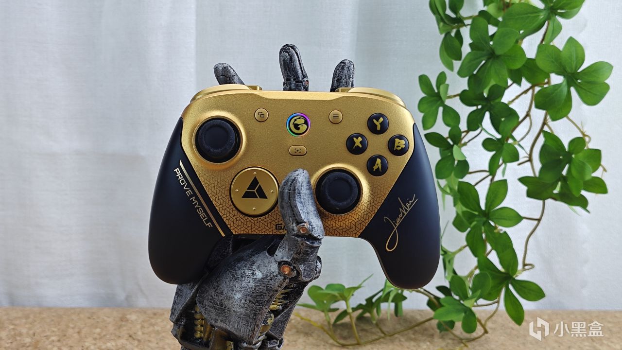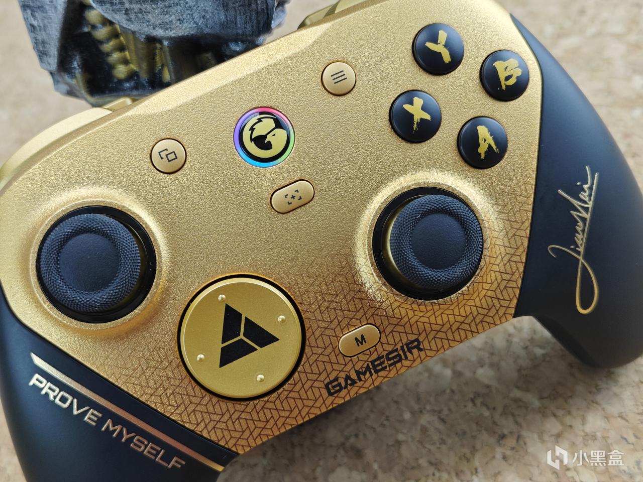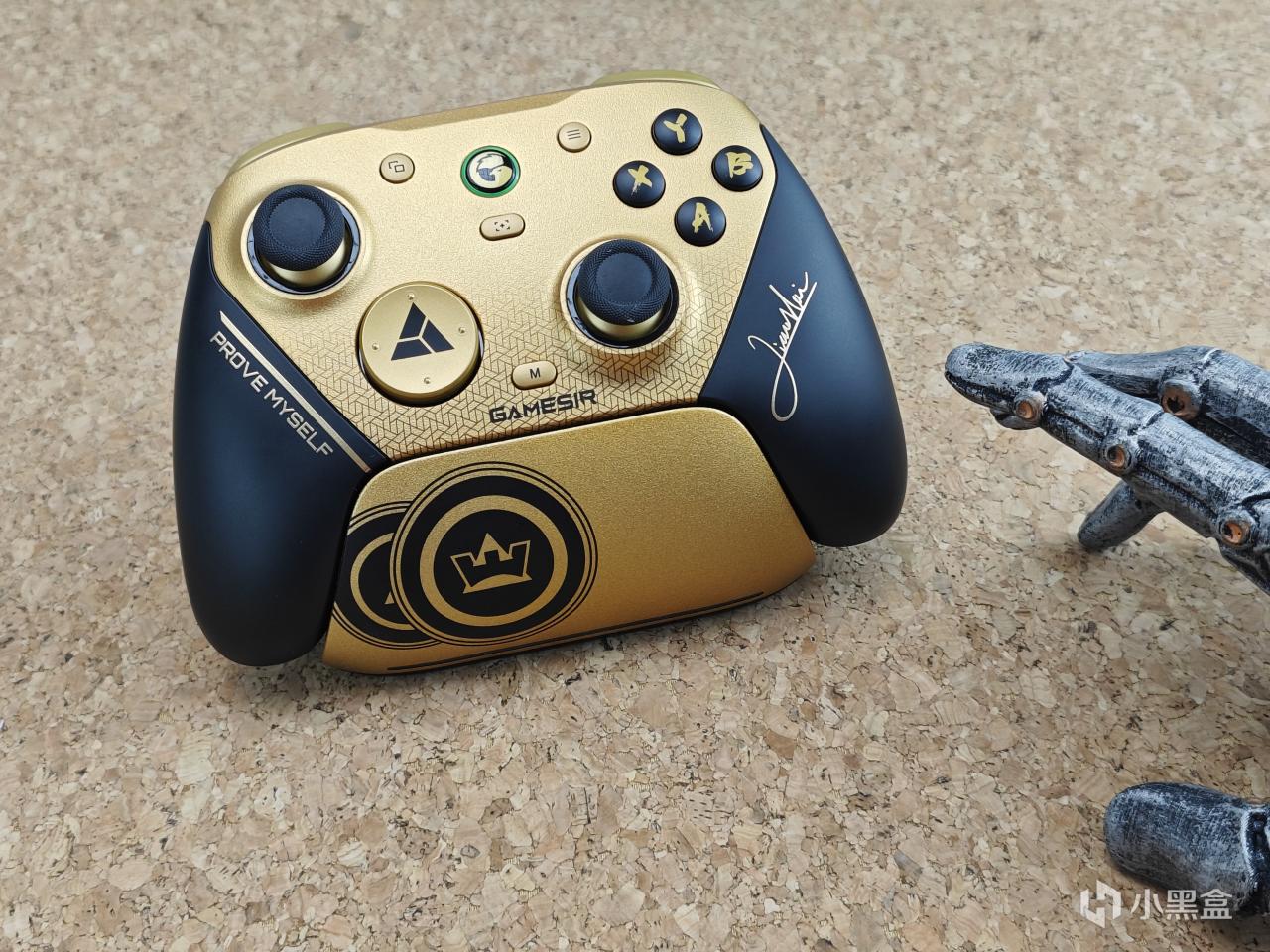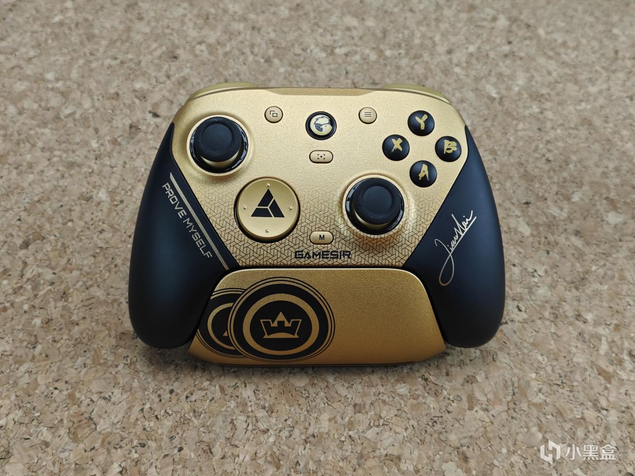 設計方面有着非常強烈的聯名味,右下角是小孩的親筆簽名,左側是奪冠發言金句“prove myself”,中間金色面殼下方還有着漸變的delta電競基因標識,十字鍵還是冠軍獎牌元素,再配上這一個是有冠軍勳章的充電底座,說真的,哪個格鬥仔看了不迷糊?