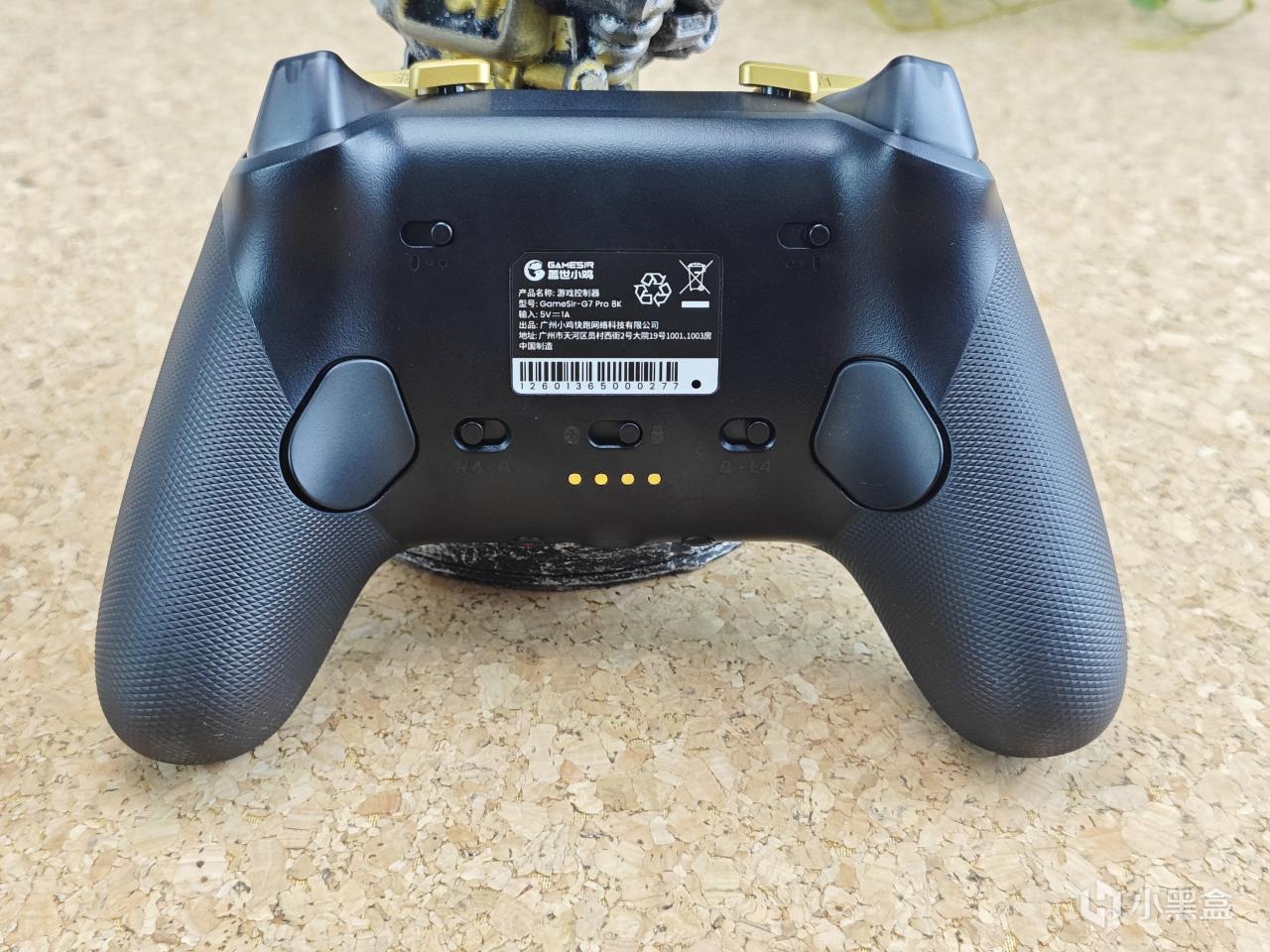 手柄背部設計比較簡單,兩側爲包膠握把,能提供一個非常不錯的防滑性能。背面設有兩顆拓展背鍵,位置設計合理,觸發輕鬆,還有背鍵鎖能鎖定,防止誤觸的可能。居中爲模式切換開關,下方四個金屬觸點可供無線充電。上方則是手柄扳機的切換開關。