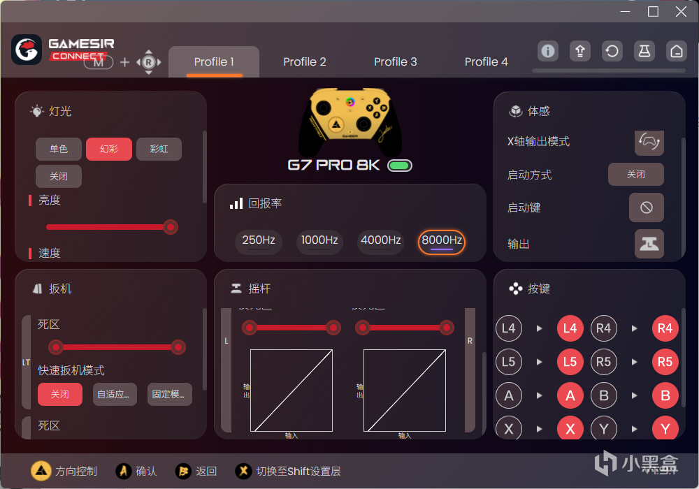 另外,手柄還有着一個非常好用的驅動,在驅動中,我們可以對手柄的各項參數進行快速調節,比如設置扳機虛位,搖桿死區,改鍵或者按鍵宏等,可玩性很強。