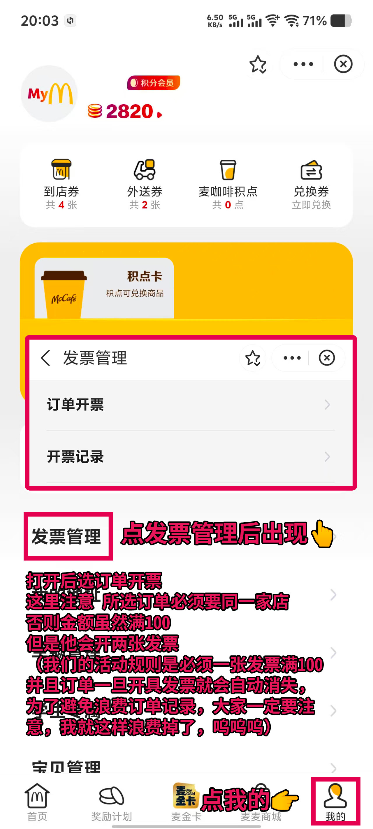 !!!一定要是同一家店的订单凑在一起,如果你是不同麦的店凑一起,他是不会开一张发票的,会给你算成两张发票开出来,这样会导致你发票未满100,还会浪费订单,订单只要开完发票就会自动消失了!!!