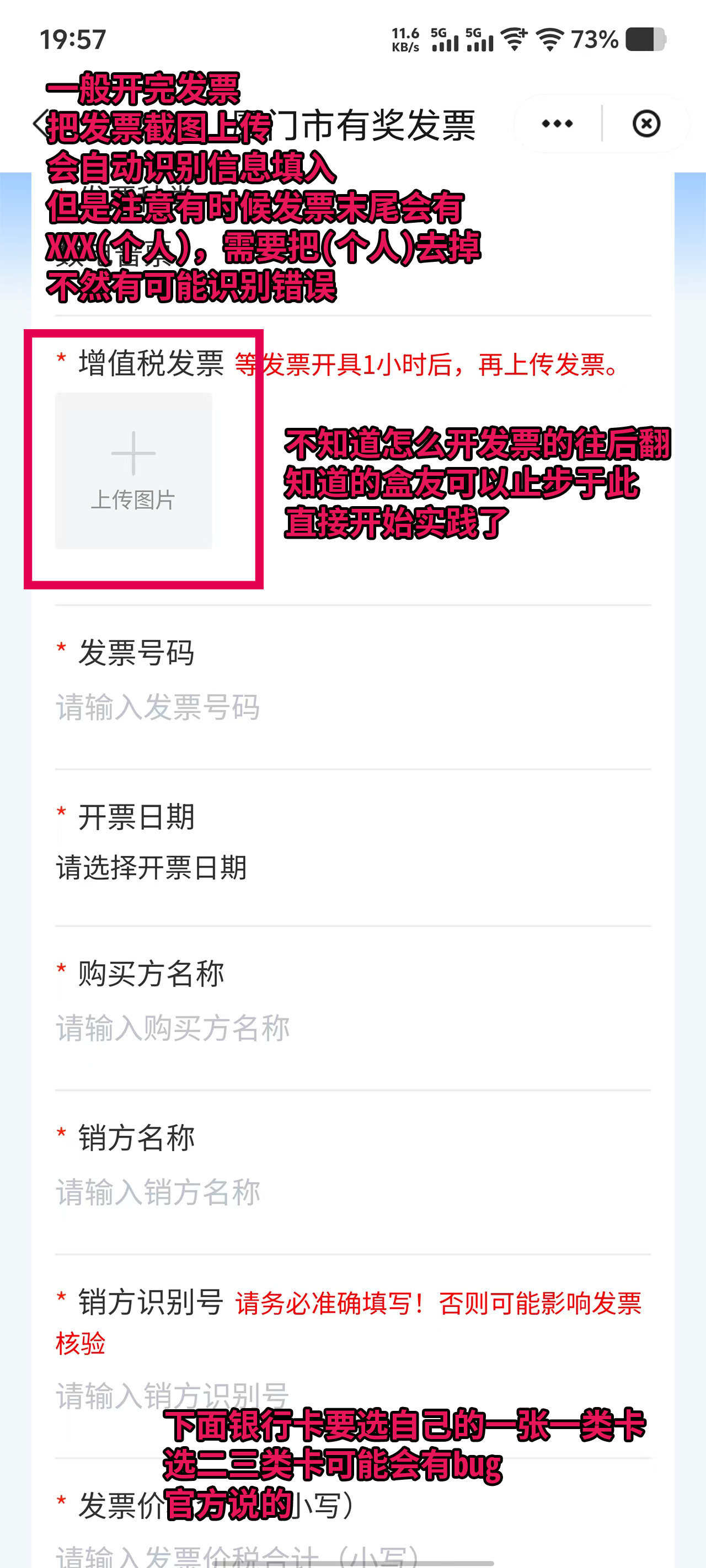 3.把开完的发票截图上传,一般会自动识别,但要注意检查一下。例如这里自动识别你的名字出来是XXX(个人),需要把“(个人)”去掉,不然容易识别出错