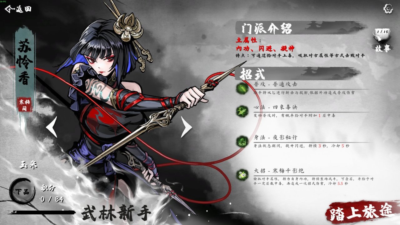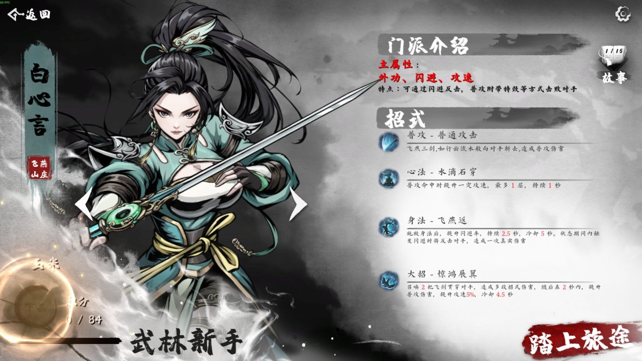游戏以武侠世界观为背景,目前开放2个门派,(寒梅阁以冰系输出为主、飞燕山庄以敏捷身法为主主,每个门派有专属技能、秘籍体系,除了技能和秘籍完全不同外,还有各自一段完整的背景故事。