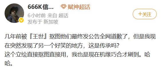 昨日,画师【666K信譞】发文表示自己的原创作品被王者荣耀抄袭了(画师才发现,原创作品被抠图当素材用了)。