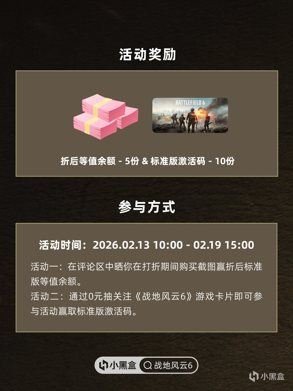 活动2:通过0元抽关注《战地风云6》游戏卡片即可与活动赢取标准版激活码。https://api.xiaoheihe.cn/store/roll_room_v2?award_id=6128