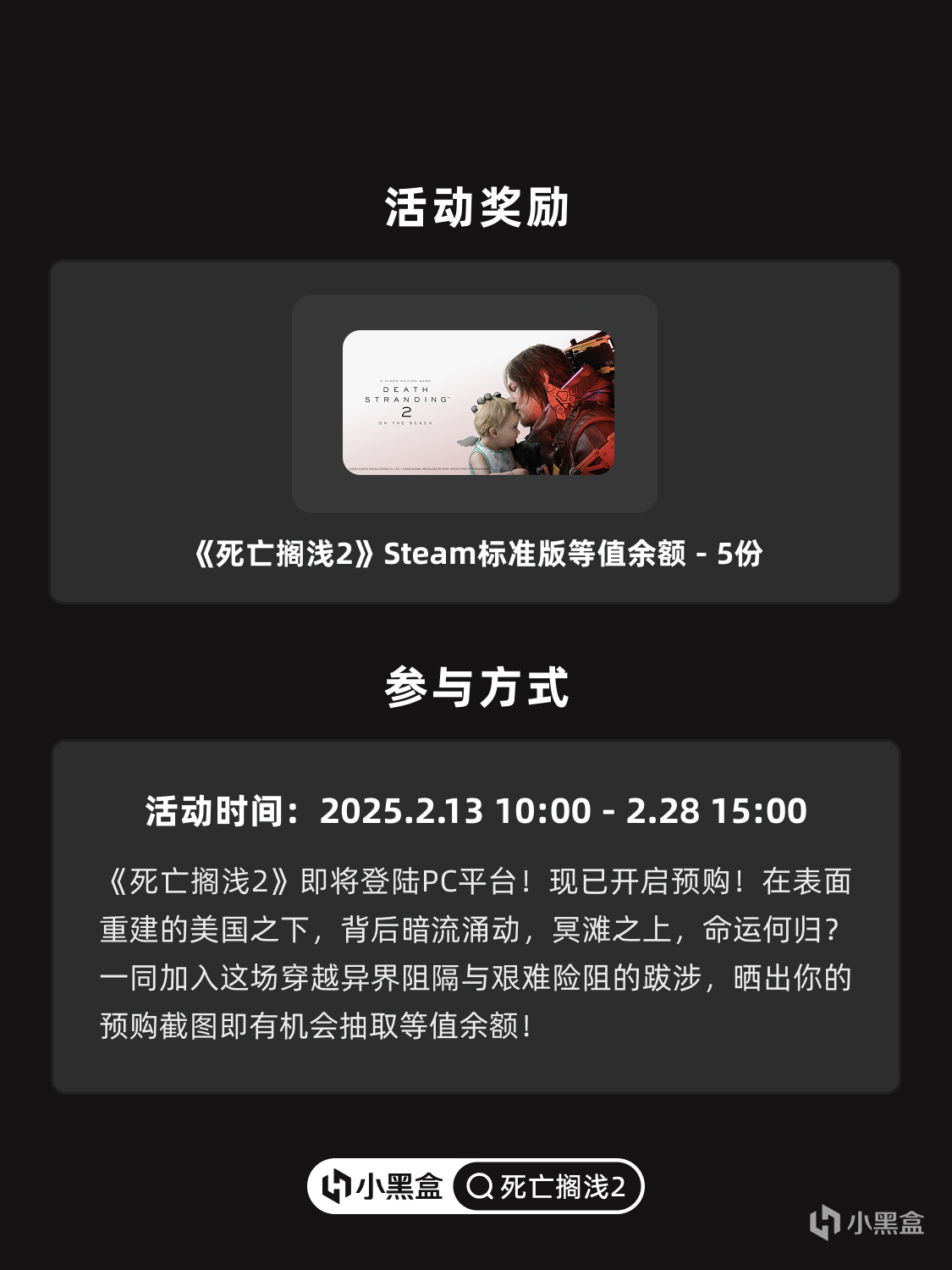 预购《死亡搁浅2》PC平台任一版本,并在评论区晒出订单截图(需附上黑盒ID水印)即可参与