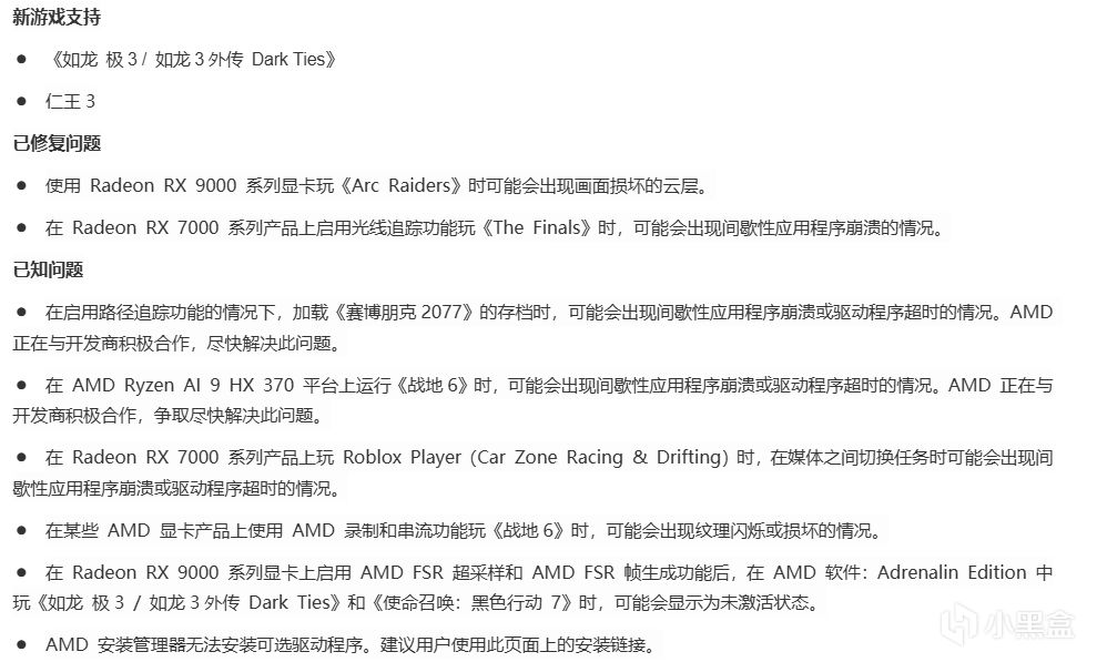 此外,在 Radeon RX 9000 系列顯卡上運行《如龍 極3 / 如龍3外傳 Dark Ties》和《使命召喚:黑色行動7》時,啓用 AMD FSR 超採樣和 FSR 幀生成功能後,AMD 軟件中這些功能可能顯示爲無效狀態。