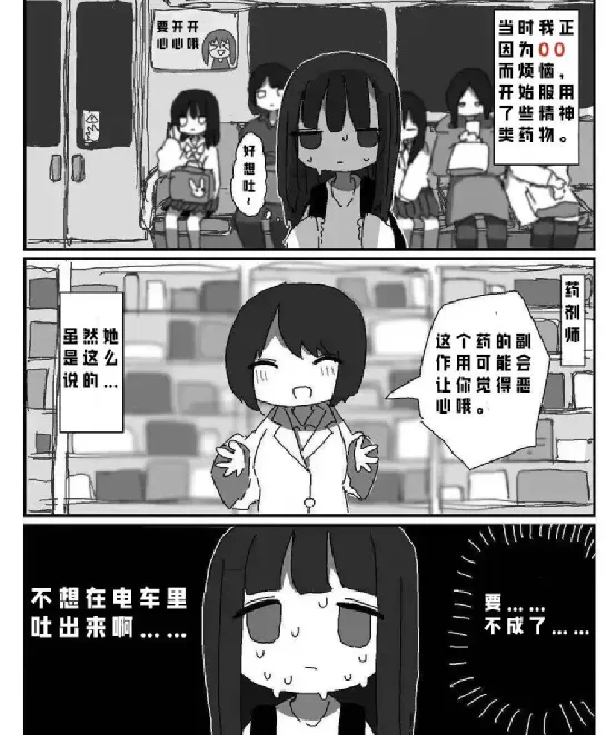 其实是作者自己的自传,当时她因为精神上有些问题,所以服用了相关药物。但是这个药有副作用,于是在电车上她想吐。而这个经典的镜头就是“忍不住”前一刻的恐惧。