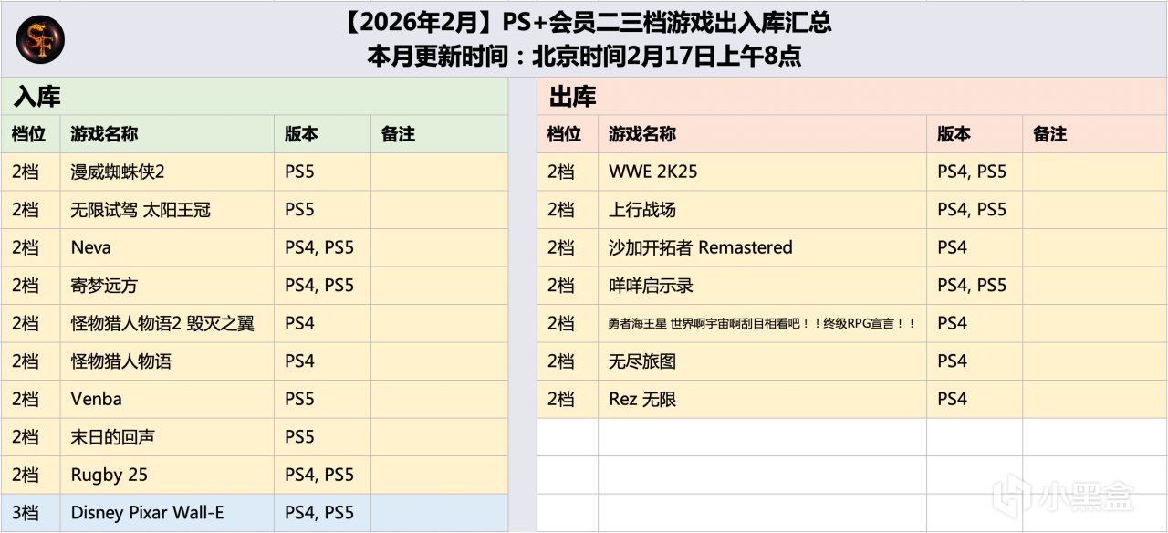 2026年2月的PS+會員二三檔入庫遊戲目錄已公佈,《漫威蜘蛛俠2》領銜,出入庫彙總如下: