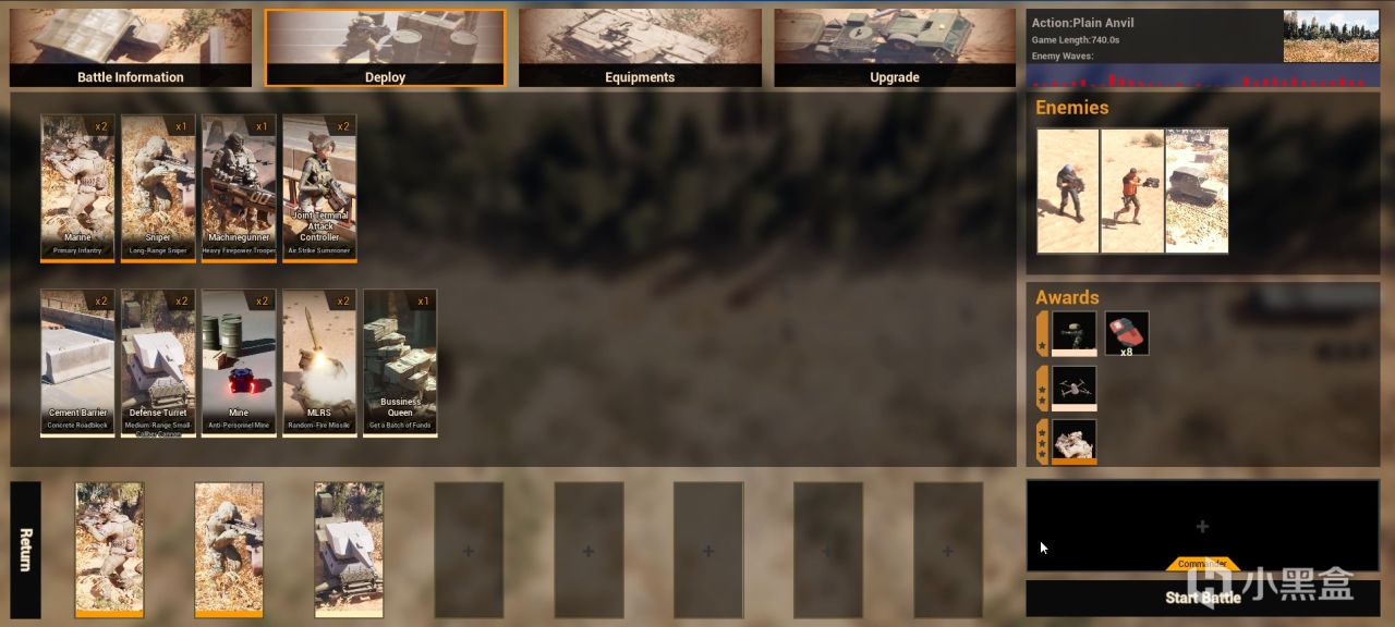 我们根据敌我形势,选择了出动步兵+狙击手的单位组合,还有速射炮塔技能的组合。