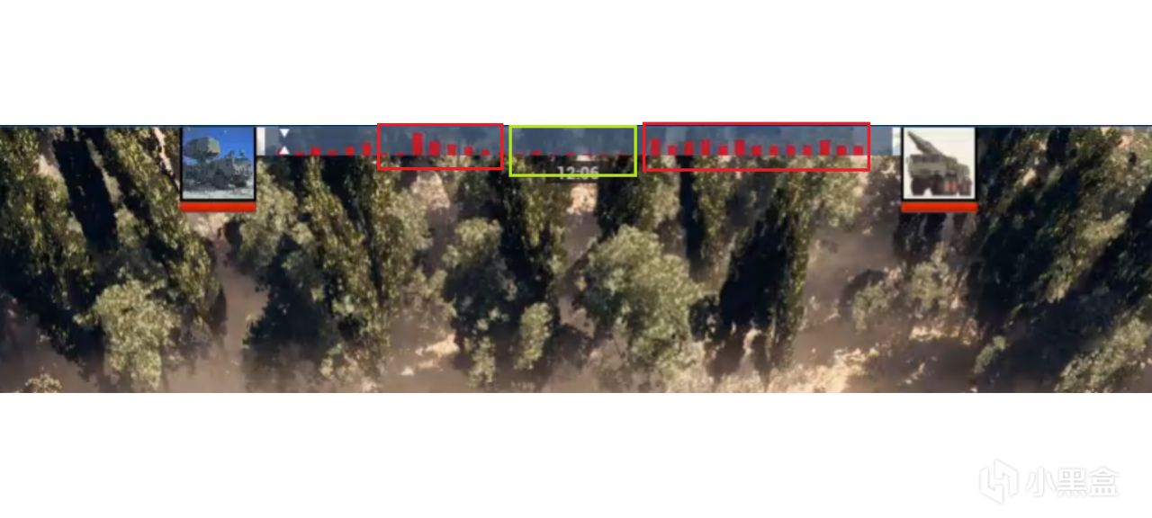这里是位于屏幕上方的敌人出兵的进度条,红色的柱子代表敌人的出兵点,柱子的高度代表该出兵点的敌兵强度(包括敌兵数量和能力值等),而白色的指示三角形代表当前的时间点,当它指向某一柱子时,该出兵点就会暴兵。我们可以看到红色方框里面柱子比较高,这说明这两个时间区域内敌人会大量出兵,而绿色方框里的柱子高度比较低,这说明敌人在这个时间区域内出兵较少。所以,我们的策略就是要在第一个红色方框内和敌人鏖战并坚持时间到达绿色方框内,这是后我们就可以呈敌人较弱时发起冲锋,并且在时间到达第二个红色方框之前解决战斗,否则敌人会在第二红色时间方框内大量暴兵,这就对我们很不利了。