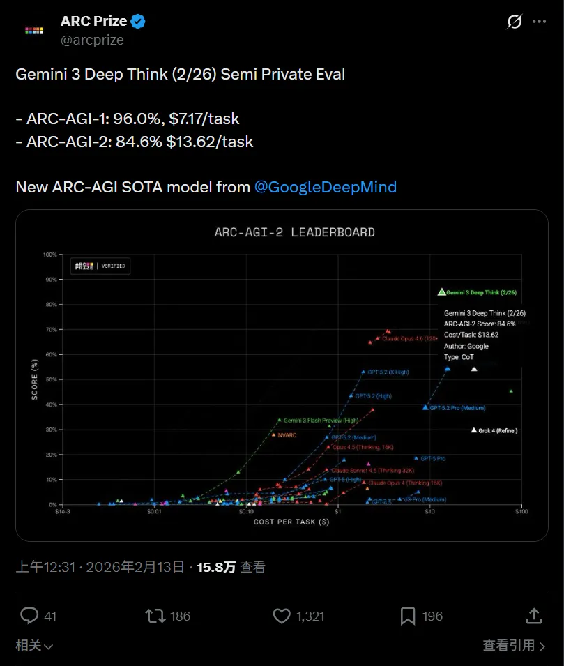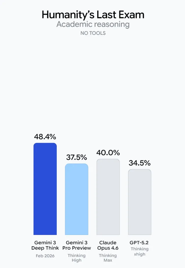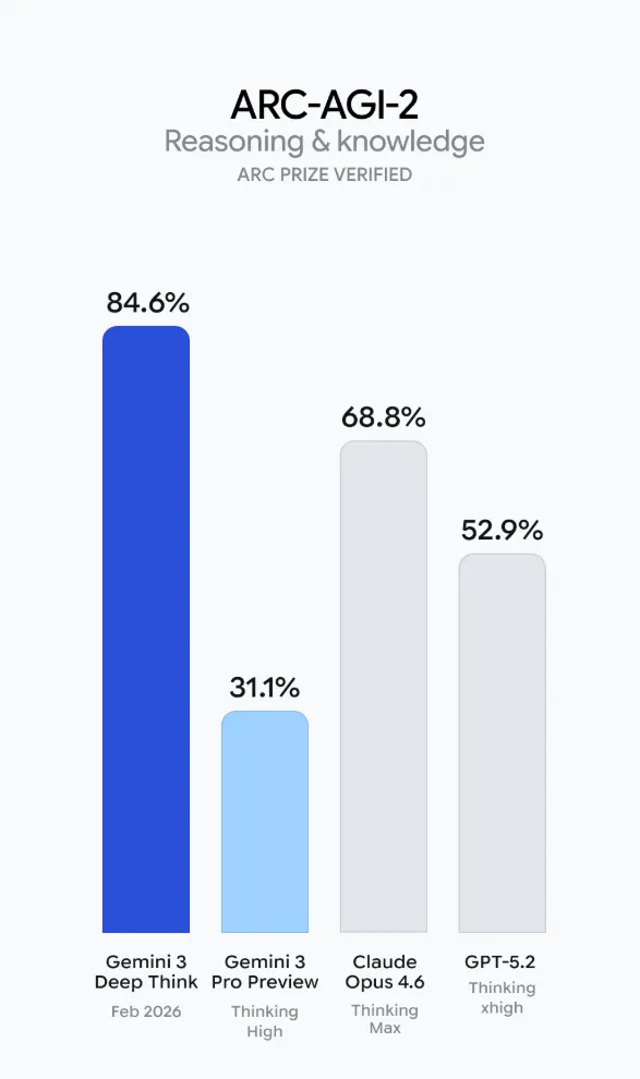 此前,Gemini 3 Pro Preview 只有 31.1%,这次 Deep Think 直接冲到 84.6%。