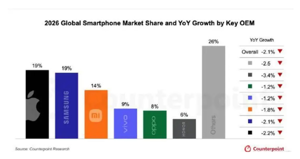 市場研究機構同步下調預期,IDC預測中國智能手機出貨量將跌至2.78億臺,同比萎縮2.2%;Counterpoint則將全球出貨預測調低2.6%,預計全年下滑2.1%,這場由存儲芯片引發的行業震盪,正從成本端向市場端持續蔓延。