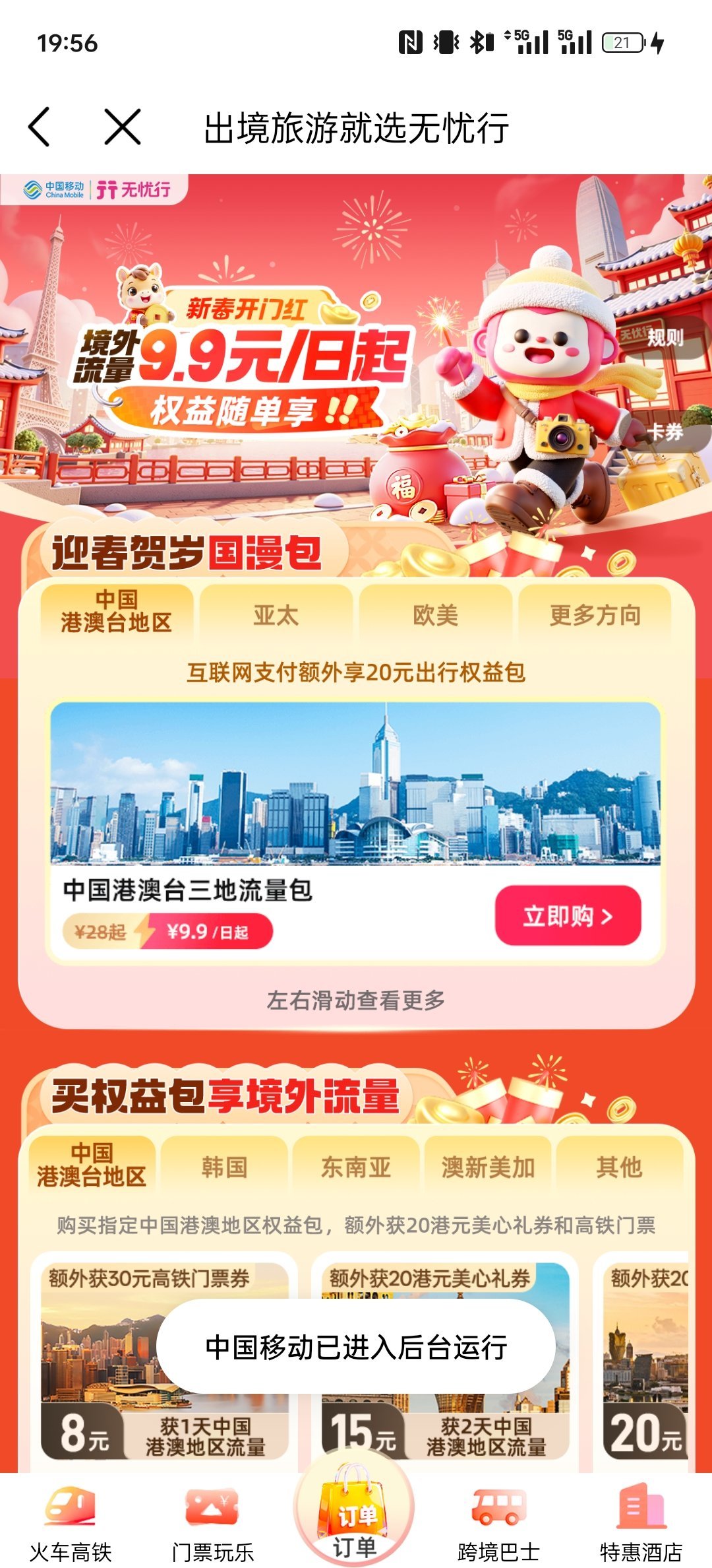 b.支付宝→出境以后刷新流量自动切换为香港→进入主界面→上方原有的“出行”自动变为境外出行