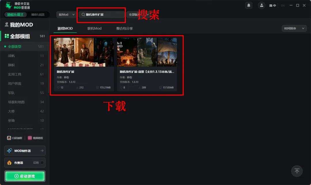 2、在右上角的搜索框中搜索“随机事件扩展‘’和“MOD四前置”下载完成后在下载管理选项中进行安装