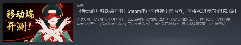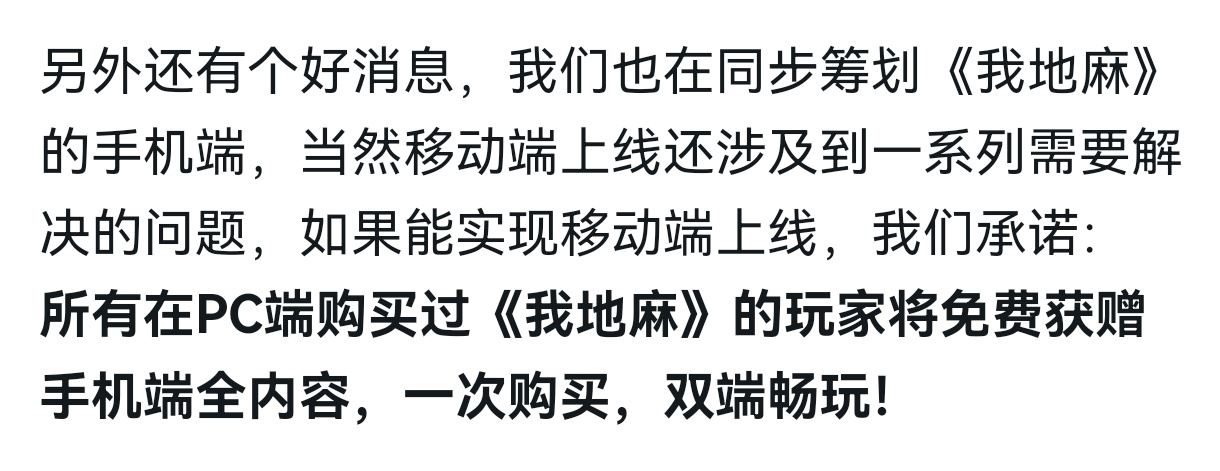 《我地麻》准备在移动端上线,并且给所有pc端买过《我地麻》的玩家赠与手机上的全内容,不需要再付钱,直接买一送一。
