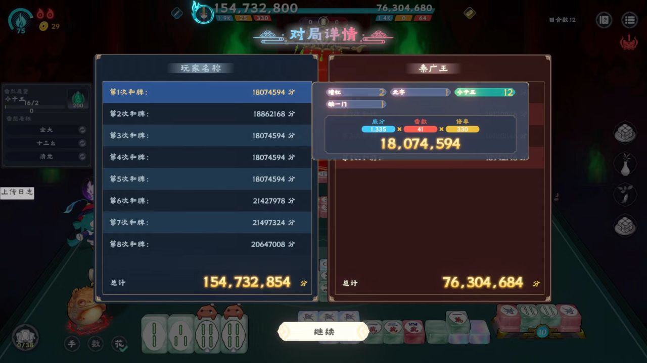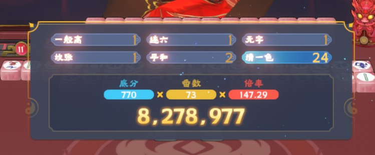 在运气好的情况下,特殊牌型加上稀有构建可以胡出极其巨大的分数。