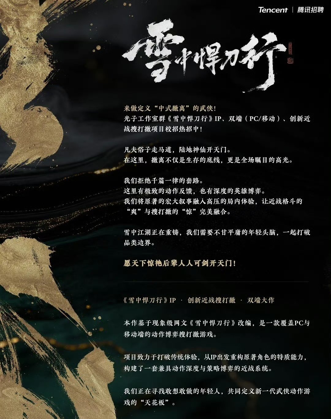 定位爲“中式搜打撤”玩法,覆蓋PC與移動雙端。遊戲以近戰格鬥爲核心,融合高強度撤離對戰機制,強調動作反饋與角色對抗,旨在將原著宏大的江湖敘事轉化爲局內高壓、爽快並存的沉浸體驗