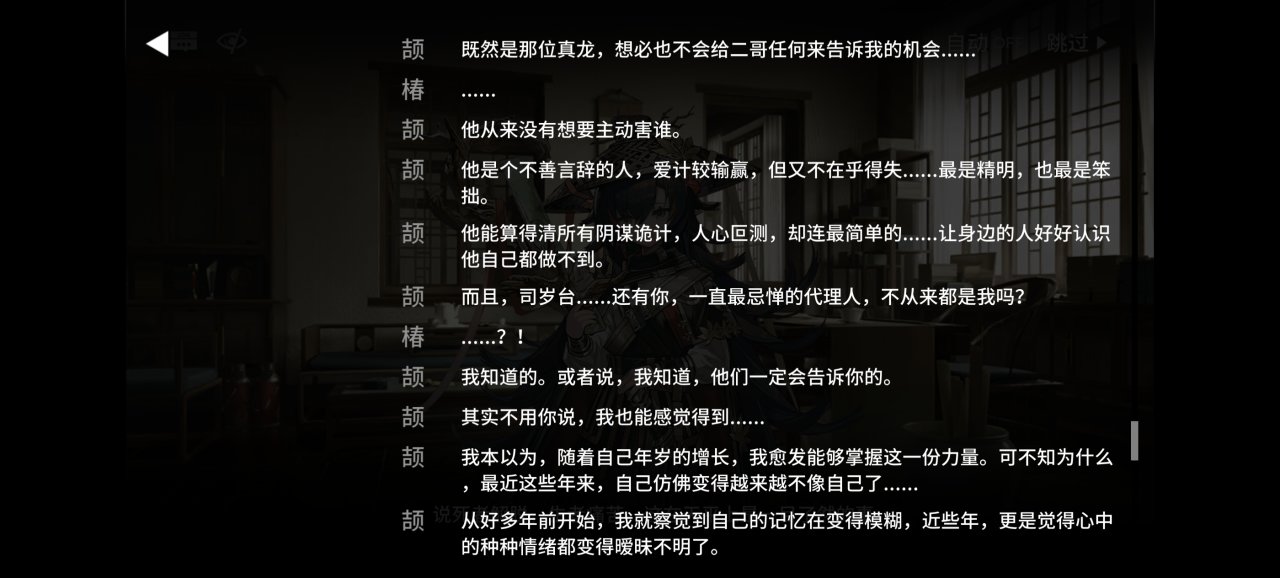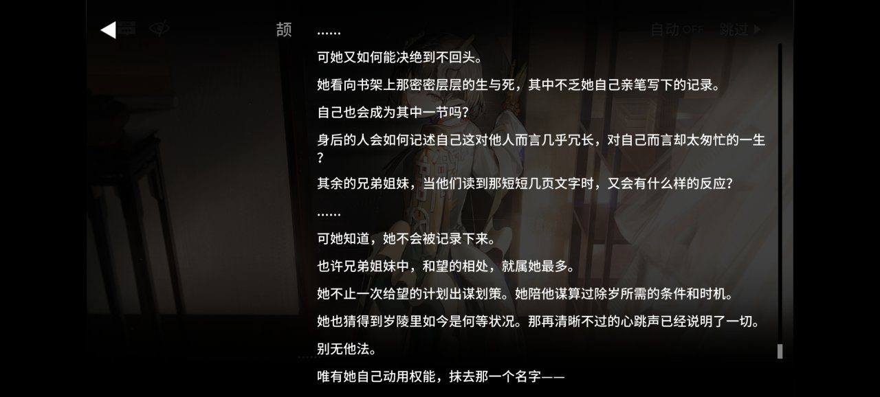 第一次除岁,二爷进入岁陵后很快所有兄弟姐妹都察觉到了异变,为了保护二爷,以及压制岁。颉以目前的能力确实是仅有的一个能从岁濒临觉醒力挽狂澜的人,于是在离开之前,颉问过椿一个问题