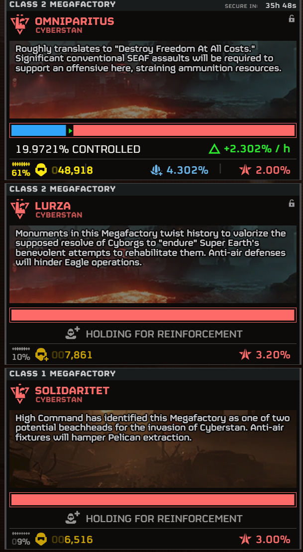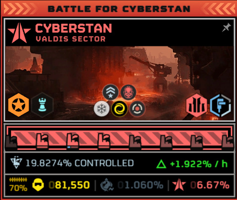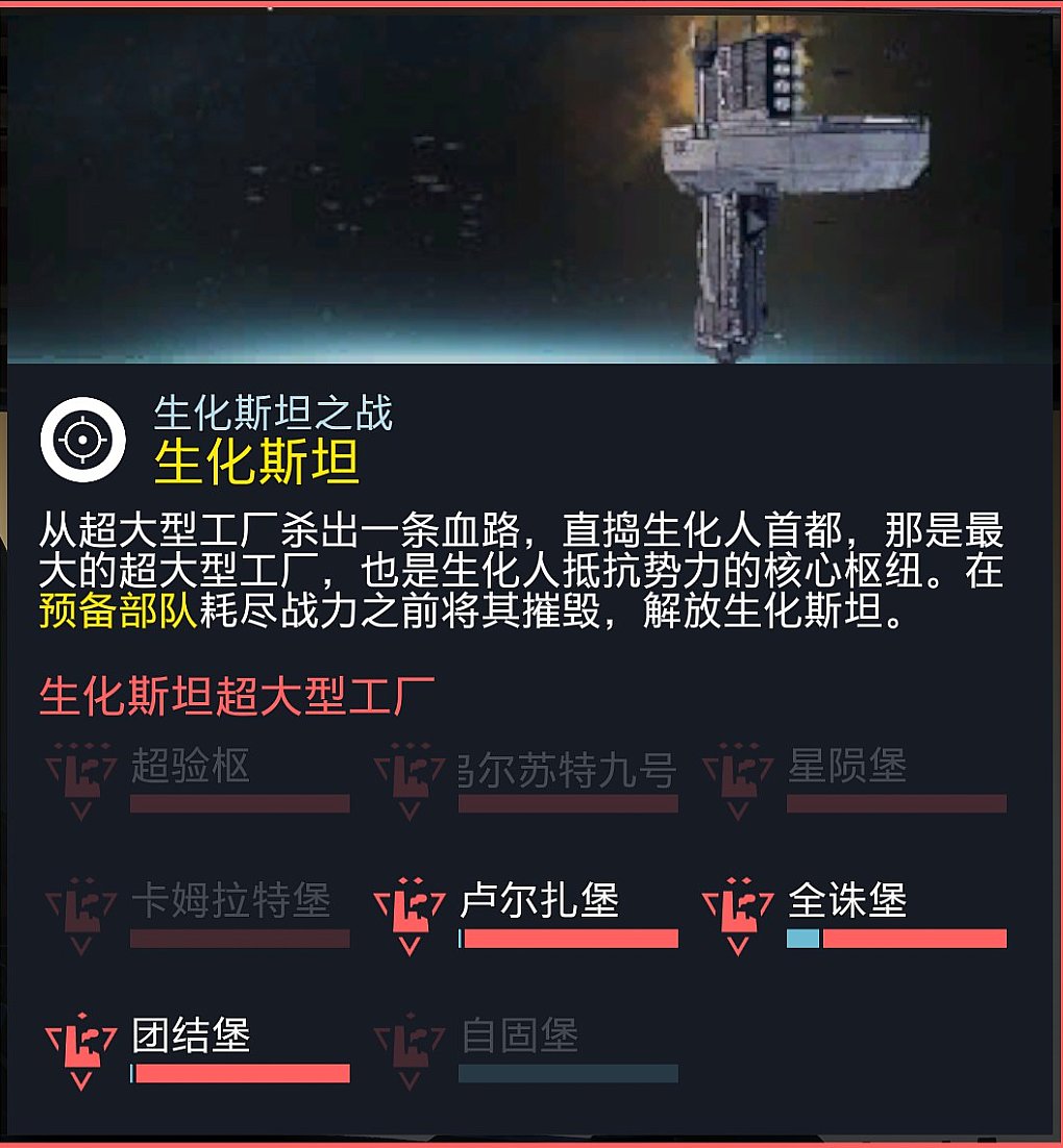 绝地潜兵部队主力现正在全诛堡展开进攻,生化斯坦占领区域已达70%,地区进度19%,预计35H内完成目标。
