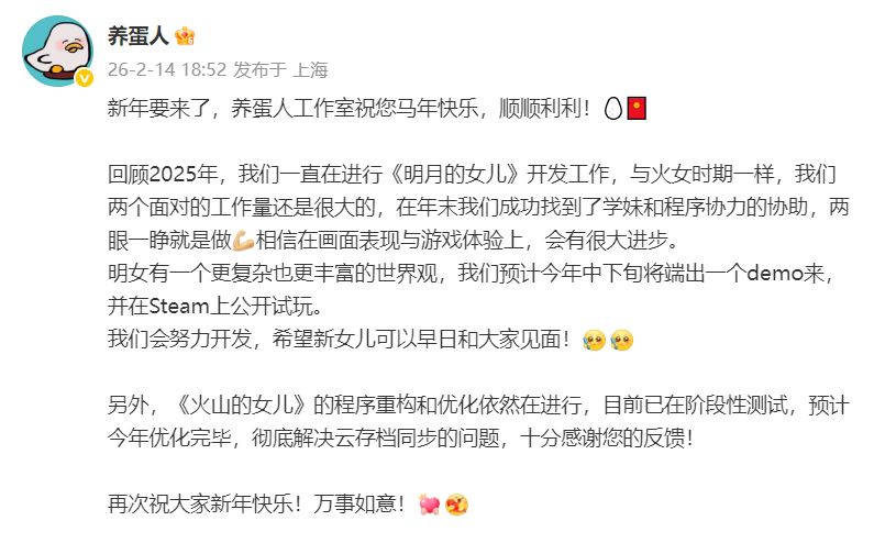 养蛋人工作室今晚发文回顾2025年的开发工作进展。