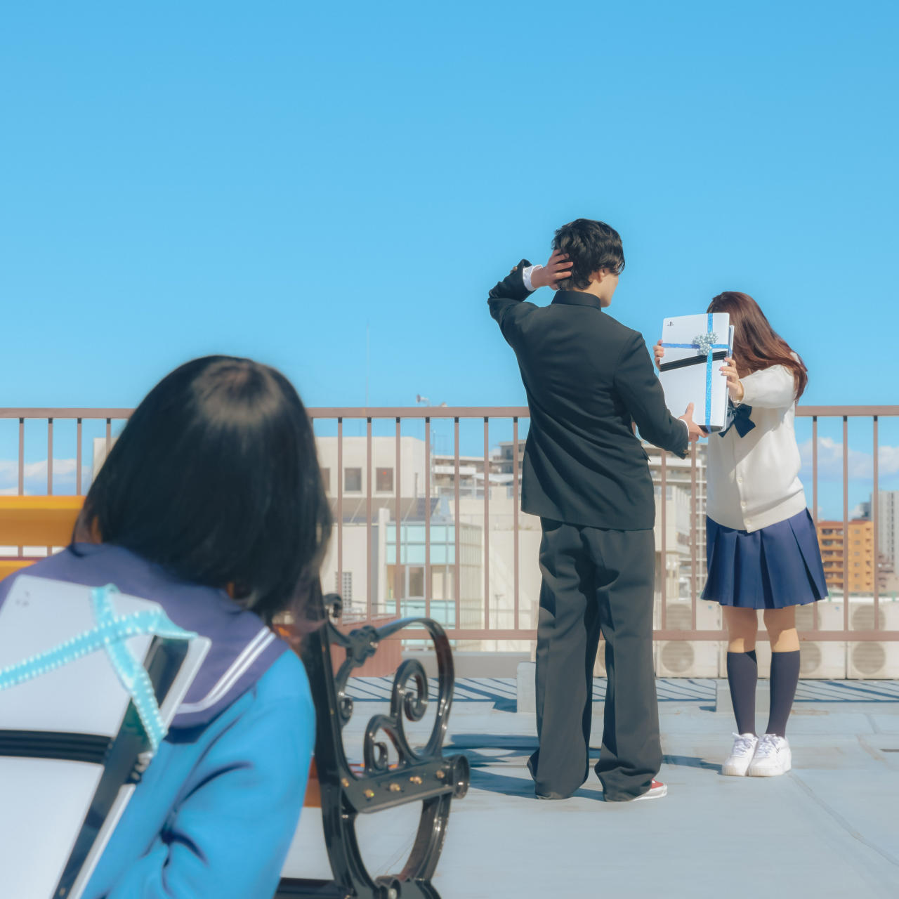 (一名少女送给心仪的男生一台PS5 Pro,后面还有位来迟一步的少女)