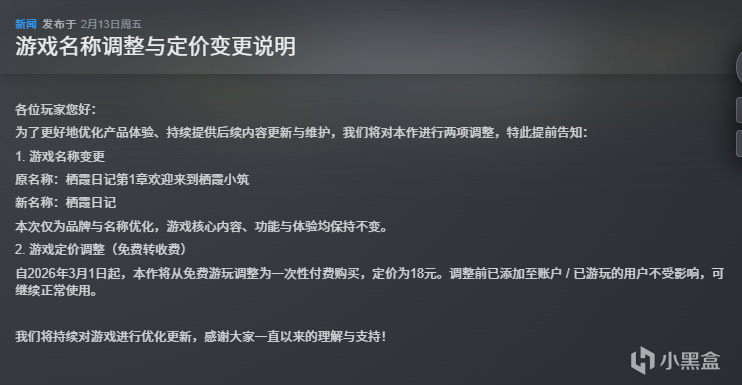 《栖霞日记》自 2026 年 3 月 1 日起,游戏將由免费转为付费。