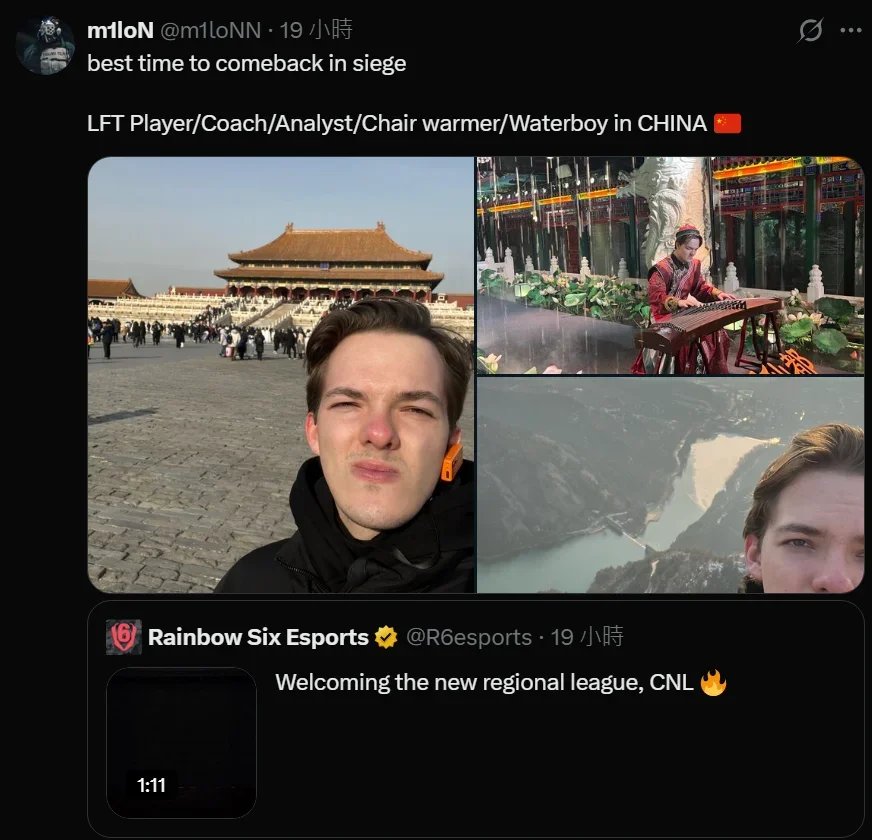 2月13日,俄罗斯退役选手“M1loN”转载R6Esports推文时分享了其在中国游山玩水的照片,并附文: