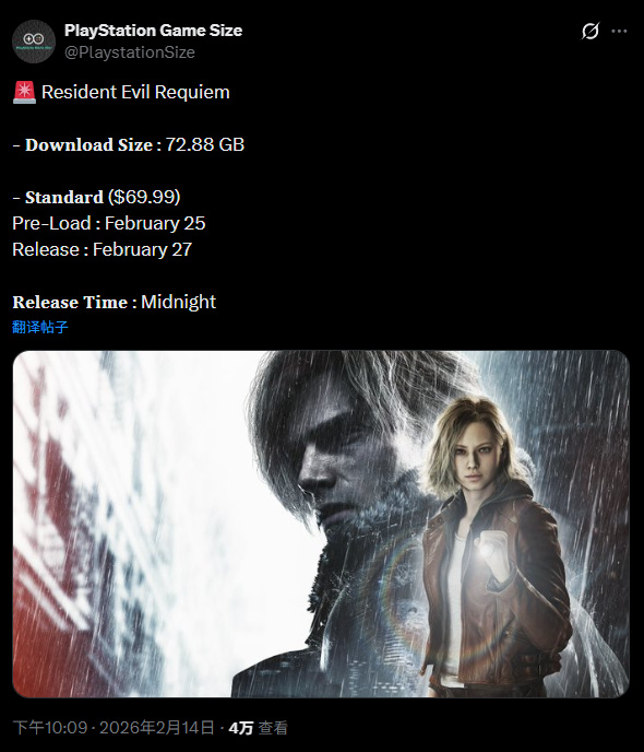数据挖掘者 PlayStation Game Size 发布了《生化危机9:安魂曲》PS5版本的详细发售信息。据披露,游戏容量为 72.88 GB,PS5平台标准版售价 518 港币,豪华版售价 598 港币,本作将登陆 PC、PS5、Xbox Series X/S、Switch2 平台。