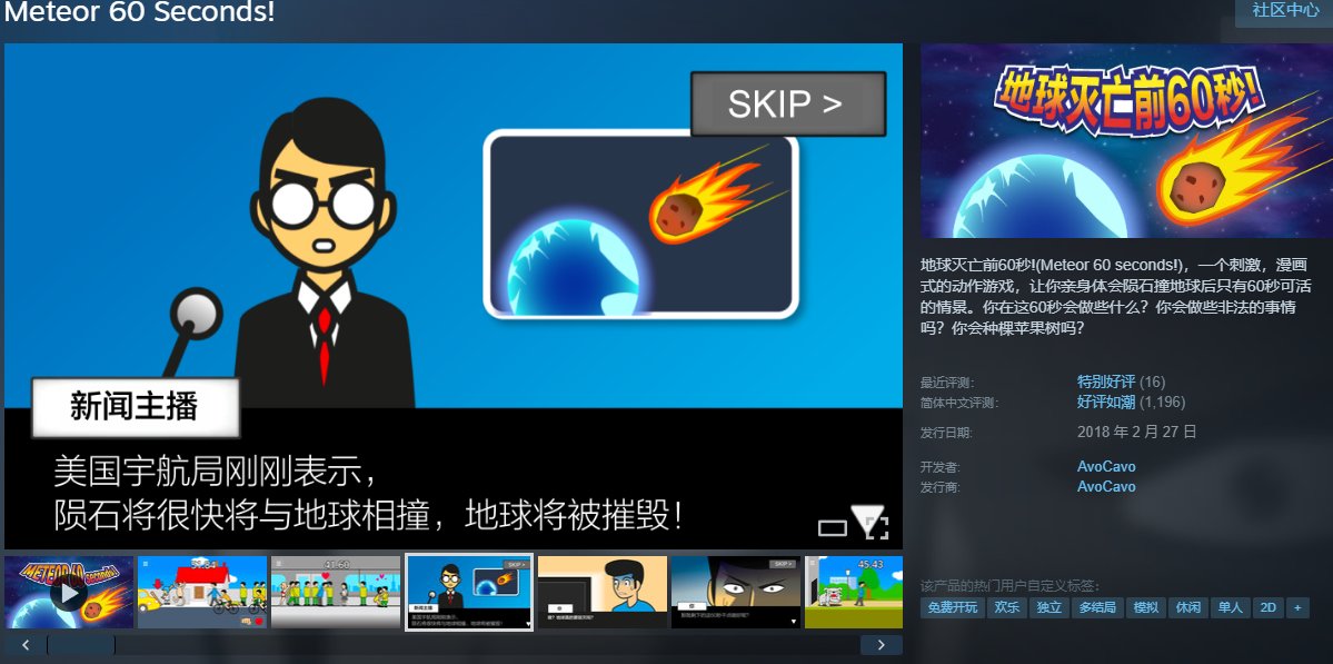 地球灭亡前60秒!(Meteor 60 seconds!),一个刺激,漫画式的动作游戏,让你亲身体会陨石撞地球后只有60秒可活的情景。你在这60秒会做些什么?你会做些非法的事情吗?你会种棵苹果树吗?