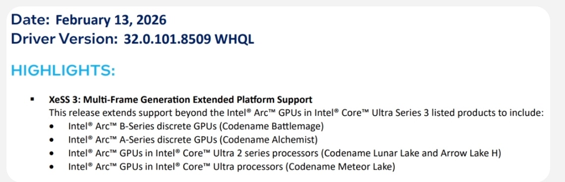 英特尔近日正式发布适用于Windows系统的全新WHQL认证图形驱动程序(版本号32.0.101.8509),正式将XeSS 3多帧生成功能(Multi-Frame Generation)扩展至旗下全系显卡产品。此次更新涵盖Arc B系列(代号Battlemage)、Arc A系列(代号Alchemist)独立显卡,以及搭载Intel Arc核芯显卡的Core Ultra系列处理器平台,标志着英特尔首次在公开驱动说明中明确支持集成显卡的多帧生成功能。