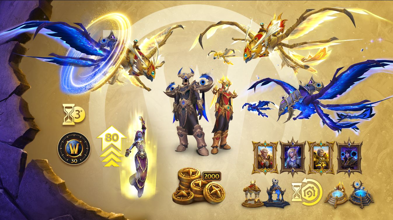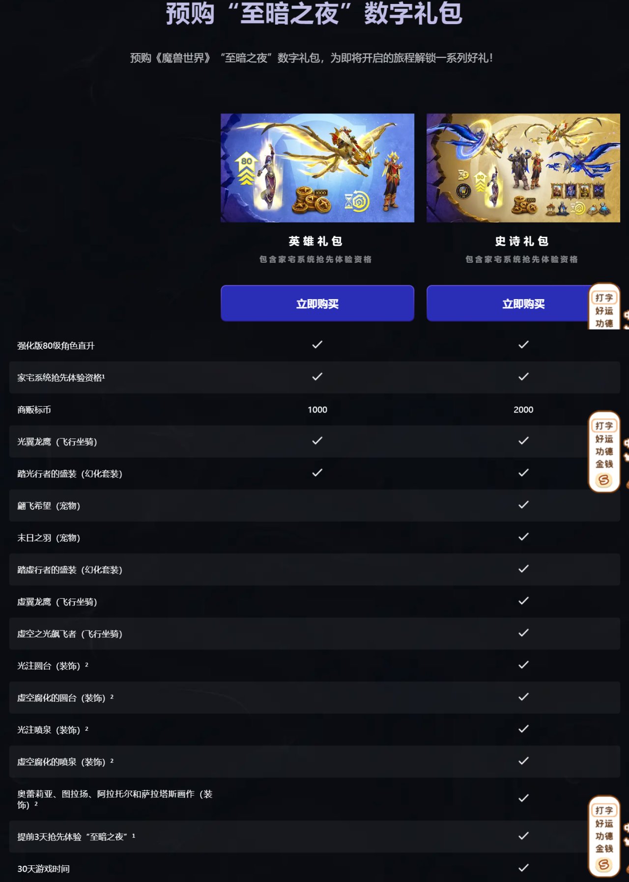 史詩禮包則在此基礎上再添1000商販標幣(累計2000)、希望之翼與厄運之羽寵物、虛空行者幻化套裝、虛空龍鷹與虛空湧浪者坐騎、住宅裝飾物套裝、測試資格、3天搶先體驗權及30天遊戲時間。