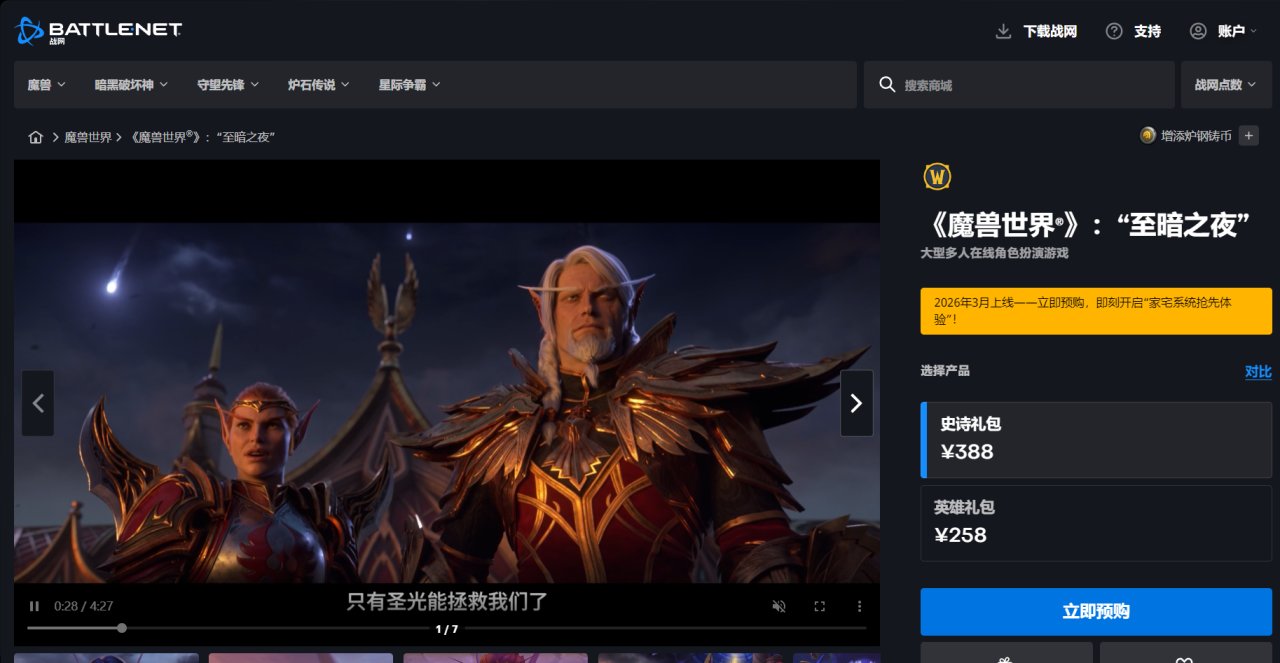 預熱了近半年,《魔獸世界》的第11部資料片“至暗之夜”終於宣佈要在3月3日上線。暴雪透露:至暗之夜資料片英雄禮包與史詩禮包售價分別爲258元與388元。該資料片是“世界靈魂史詩”三部曲中的第二篇章,承接《地心之戰》,後續還將推出《末位泰坦》。