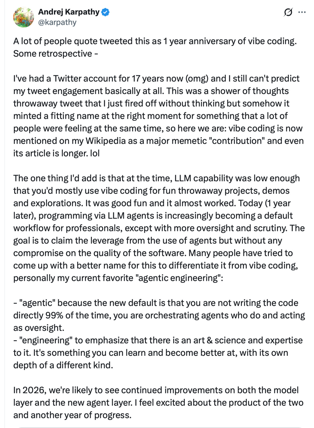 我使用 Twitter 已经 17 年了(天啊),但我依然完全无法预测我的推文互动量。这只是一条我在洗澡时灵光一现、没过脑子就发出去的随意推文,但不知怎么的,它在一个正确的时刻,为很多人当时的共同感受起了一个恰当的名字。所以就到了今天:“氛围编码”(vibe coding)现在作为主要的模因(memetic)“贡献”被写进了我的维基百科,甚至相关的词条篇幅还挺长。lol