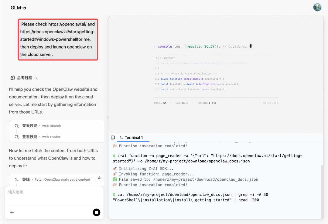 如图这么一小段话,直接让 GLM 帮我部署一个 openclaw到云服务器上。