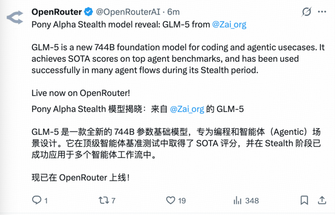 GLM-5其实就是之前在 OpenRouter中的神秘模型——Pony Alpha