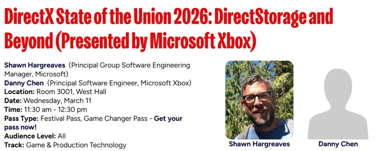 2026 年游戏开发者大会(GDC 2026)的议程中的微软 Xbox 呈现的“DirectX 2026 :DirectStorage 及更多内容”会议介绍称,它将涵盖 DirectStorage 的更新,包括计划中的 Zstandard 压缩支持 和 游戏资产调节库(Game Asset Conditioning Library),以及更广泛的 DirectX 功能,如 着色器预编译、光线追踪、机器学习集成 和 工具。