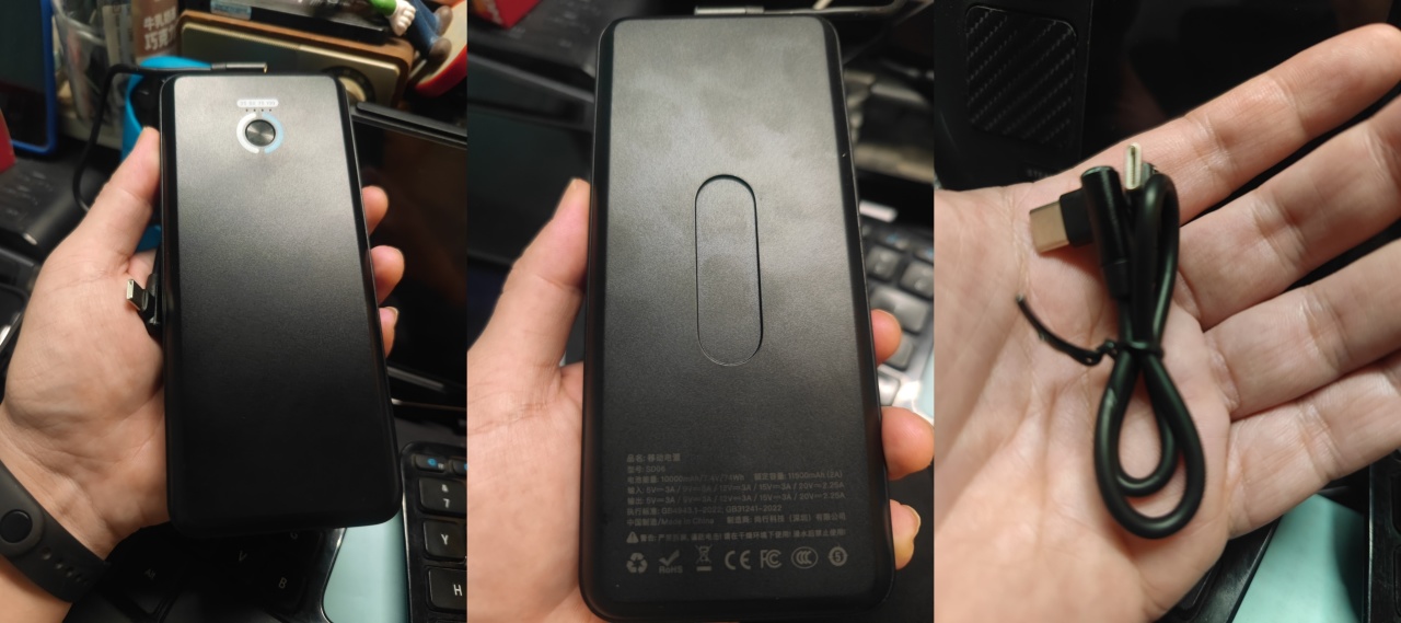 打开包装盒,包含一个充电宝似的电池,一根两头弯头的typec线,一个充电线,一个背夹壳。