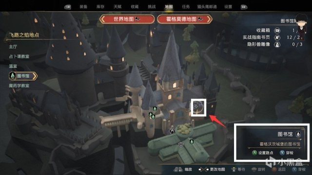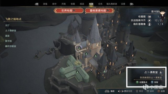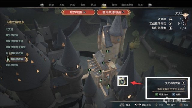 接下来是2级锁区1,霍格沃茨-天文学区-变形学庭院传送点,从传送点南门进入,右转第一个门就是,原形立现定位可以发现在里面,开门进入贴右墙有两个宝箱,桌上一个魔杖握柄宝箱,走到底还有个指南页,回头桌上还有笔记,最后剩下就是隐形兽月亮了