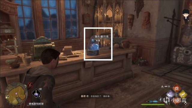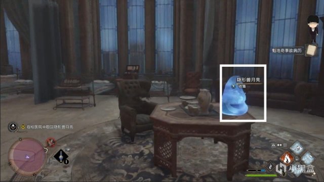无锁区3,霍格沃茨-图书馆附属-占卜课教室传送点,沿着大理石台阶一路朝上走到头,通过梯子爬上去,这里顶灯还有支线高布石好多,有兴趣的玩家可以去看看老基德的支线,进入后贴右墙走到前面桌子上就能发现隐形兽月亮了