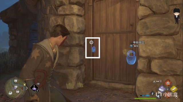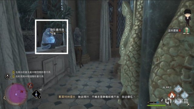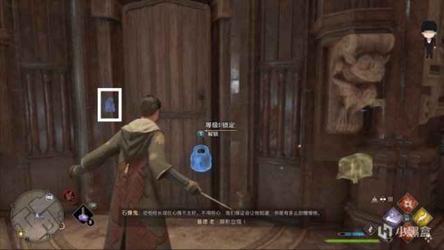 紧接着是1级锁区1,霍格沃茨-天文学区-变形学教室传送点,朝传送点左后门进入,右转下楼,开门继续左转下楼,一路朝下走到底会发现巨龙石雕,接着右转第一个房间就看到一个1级锁的门,原形立现定位就能看到屋内右边隐形兽月亮的位置,开锁进入就可以拿到