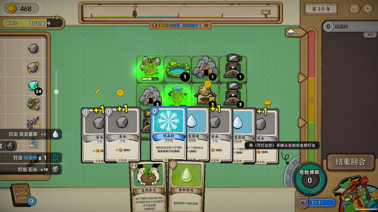 《種呱得呱》是一款肉鴿卡牌遊戲。你將扮演農場管理者,完成青蛙公司下達的KPI指標。你將通過緊張刺激的抽卡,規避或利用時間爆炸,獲得卡包和寶箱,構建你的卡組,打出卡牌獲得金幣收益。你還需要有策略性地選擇前進的路線,遊戲中你會遇到豐富的抉擇事件、災年和大天災挑戰。