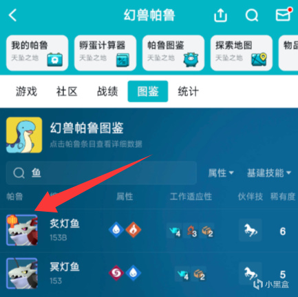 先进去《幻兽帕鲁》分区,点击图鉴,然后搜索「鱼」,就会看到一个带灯笼的炙灯鱼,点击即可