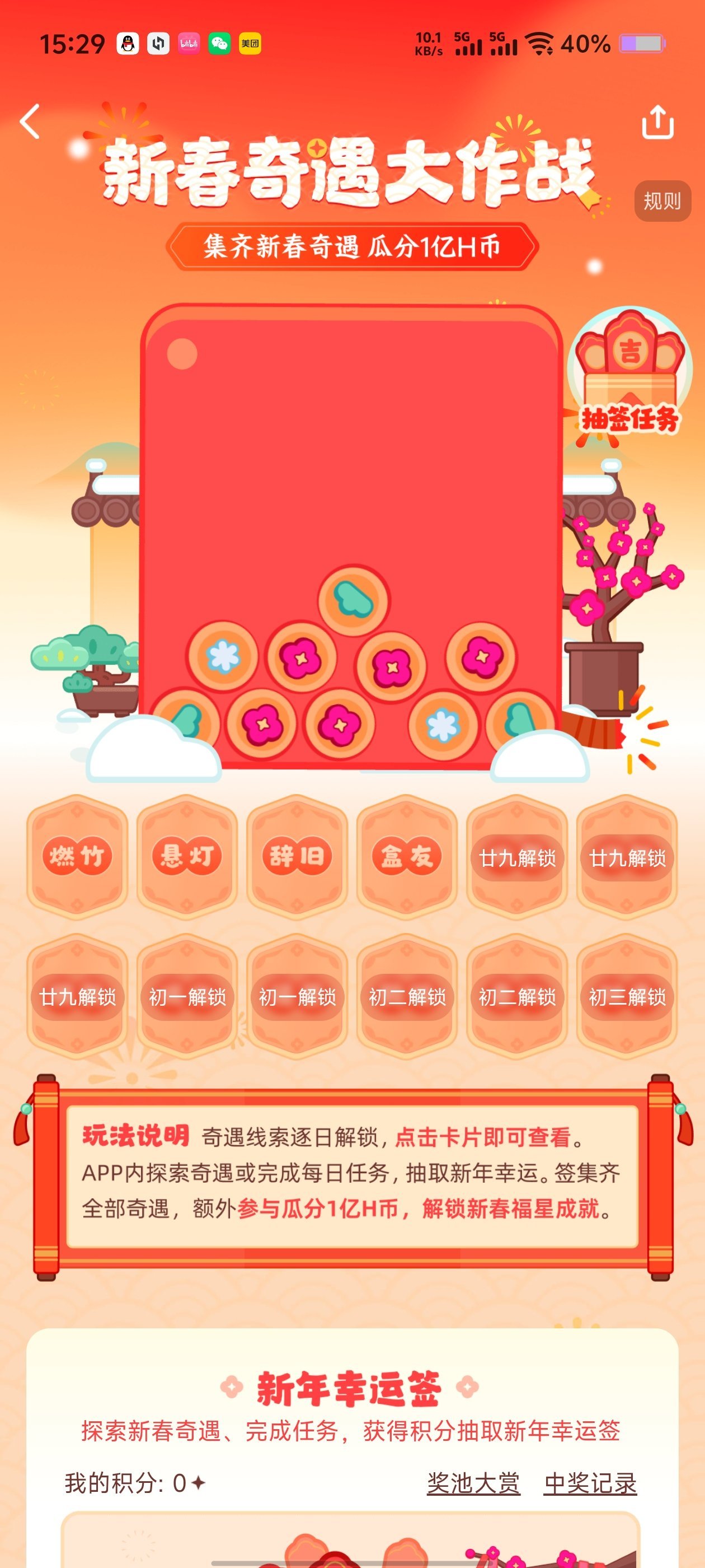 新春幸运签活活动期间,在APP内探索收集“新春奇遇”,或完成每日任务即可抽取新年幸运签!