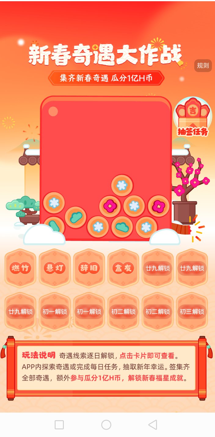 首先:玩法说明,奇遇线索逐日进行解锁,点击卡片即可查看。APP内探索奇遇或完成每日任务,抽取新年幸运。签集齐全部奇遇,额外参与瓜分1亿H币,解锁新春福星成就。