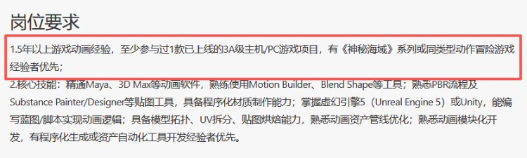 游戏战斗策划、游戏动画、游戏特效、游戏3D模型设计等主要岗位也均要求候选者“参与过1款已上线的3A级主机/PC游戏项目”。