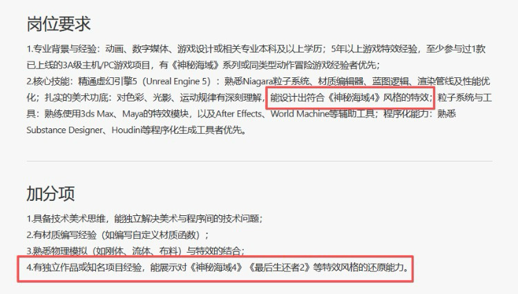 游戏特效岗位更是特别提到,候选者要“能设计出符合《神秘海域4》风格的特效”“能展示对《神秘海域4》《最后生还者2》等特效风格的还原能力”。