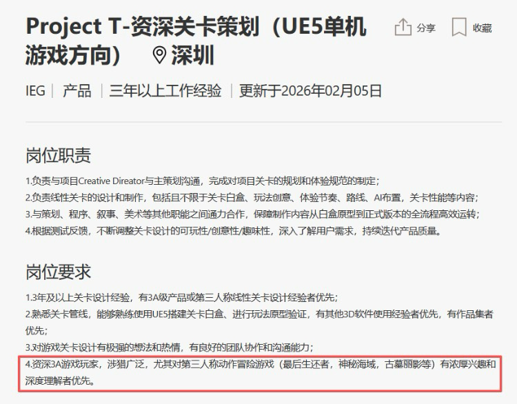 品类方面,《Project T》多个招聘岗位提到,需要候选者熟悉并理解《最后生还者》《神秘海域》《古墓丽影》等海外第三人称动作冒险游戏。